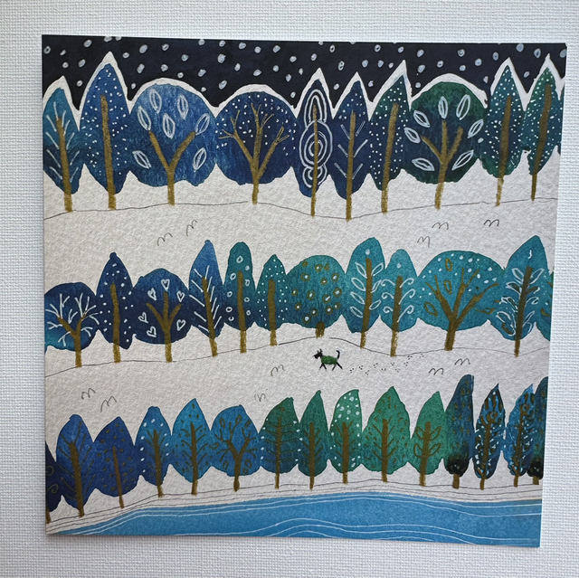 One of Shona Lenaghan’s popular tree inspired Christmas cards depicting a scene with a wee Schnauzer puppy parading about in the snow.