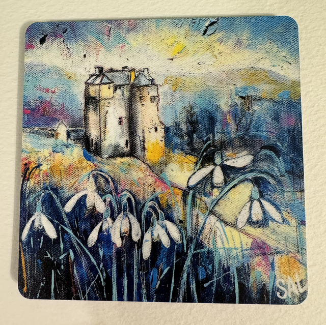 This is one of Shona Lenaghan’s popular range of Scottish Borders images depicting Neidpath Castle . The coaster is made from melamine. It is 9x9cm square with a black edging and a recycled backing.