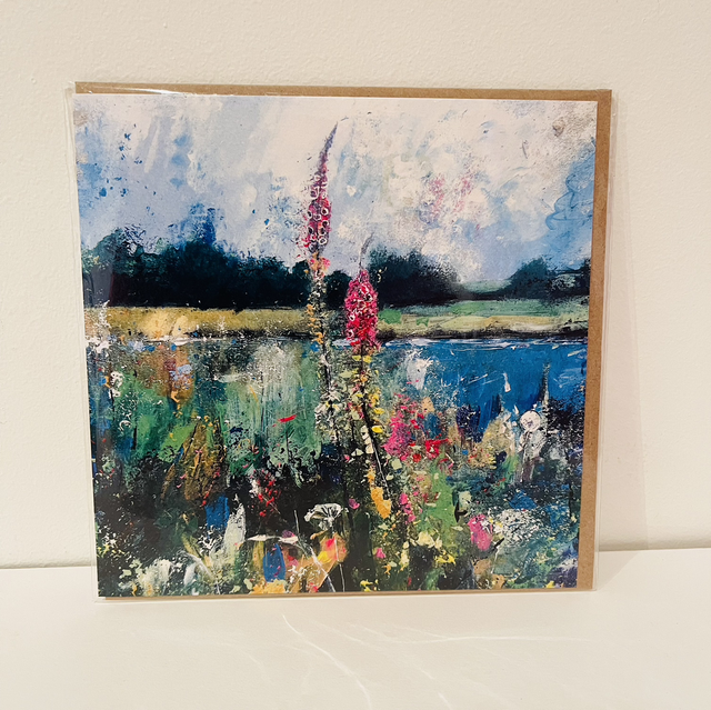 This is one of Shona Lenaghan’s range of Scottish landscape 15x15cm greetings cards. It is blank inside, is accompanied with a matching envelope and is individually wrapped in a cellophane sleeve. The artist’s details & card title appear on the back.