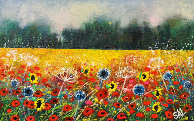 Shona describes herself as..this is a painting of a local field that I love, bursting with vibrant poppies and wildflowers. I wanted to capture the fiery red of the poppies against the golden expanse, with hints of white and blue blooms to add some variety and movement. The dark treeline in the background gives the scene depth, while the misty sky softens everything, creating a dreamlike contrast to the energy of the flowers.