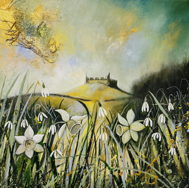 One of Shona Lenaghan’s Scottish Borders scenes depicting Hume Castle with Daffodils and Snowdrops. Signed by artist. Size 30x30cm. If posted the paper prints arrives rolled in a cardboard tube. Easy to frame